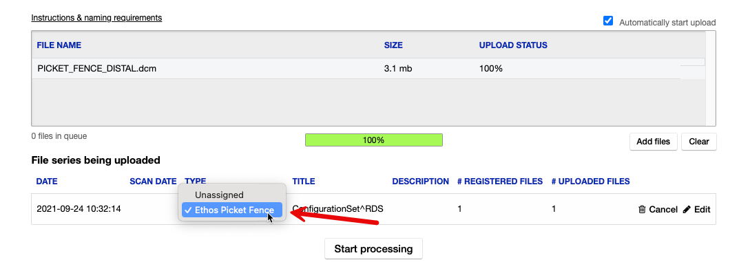 When using File Uploader, the files can be identified by the Referenced Beam Number [300C,0006] DICOM tag. Here are the values associated with each test.