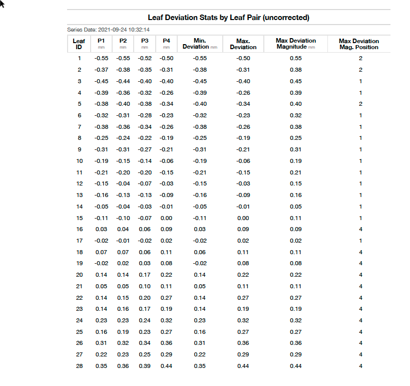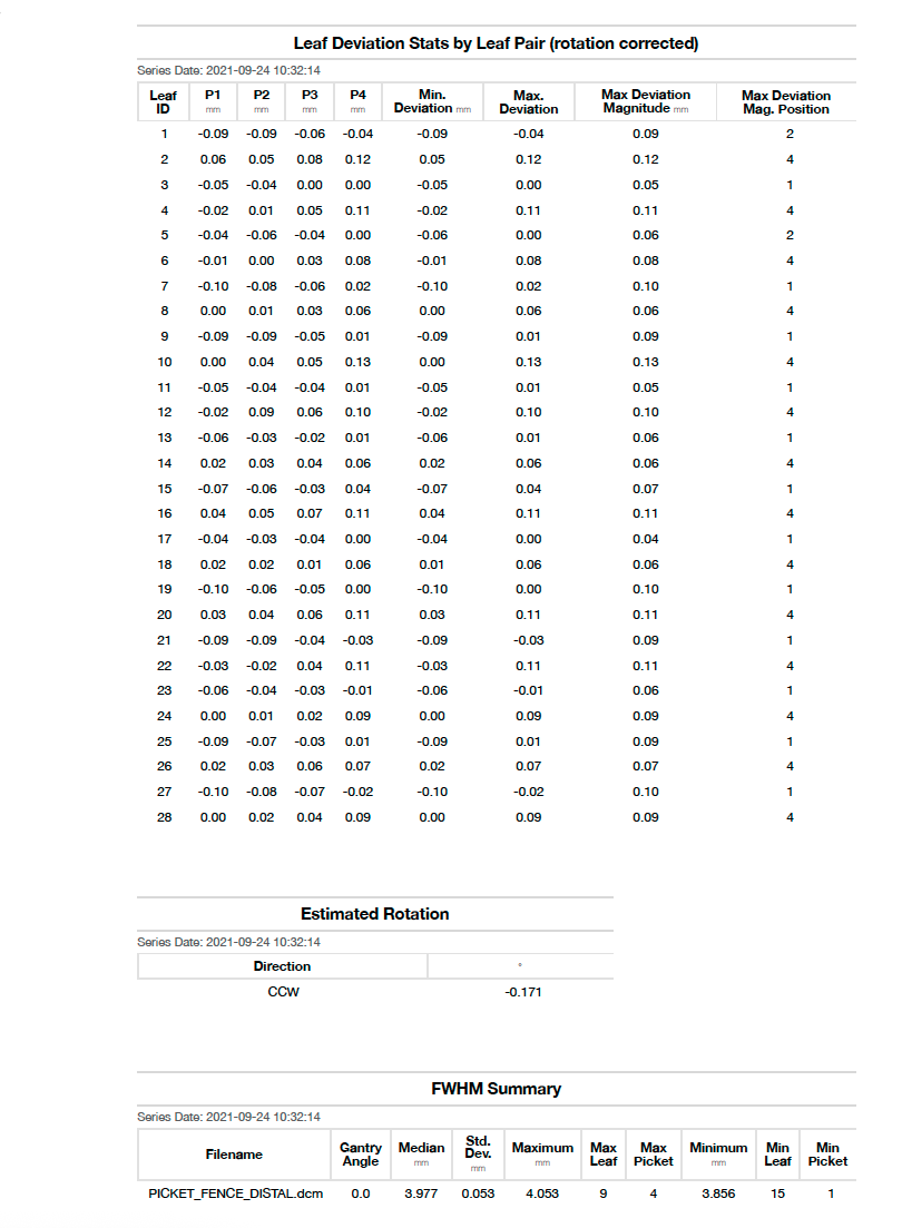 The tests include results with and without rotation correction. Rotation correction is included because modern MLCs can position the leaves very accurately, however, the relative effect of any error in collimator rotation is quite pronounced. The results with rotation correction show the effects of leaf position errors with the rotational component removed.