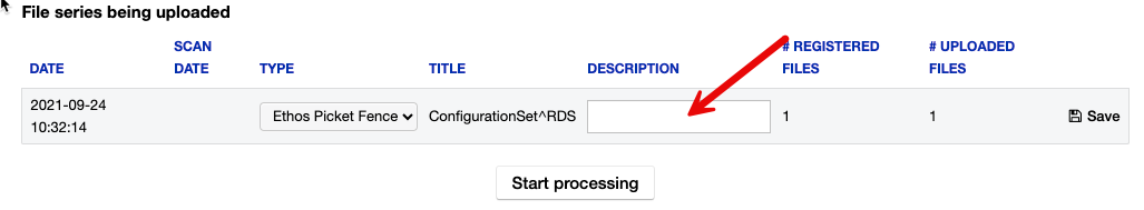 Once file series have been uploaded they will be displayed below the upload control. To remove a series from the queue click the Cancel button beside the series. To start processing click the Start Processing button. A description for the image series can be added at this point. Click the Edit button next to the series. Type a description for the series into the text box that appears below Description and either click Save or press the enter key. The description can also be edited after the images have been processed. Descriptions will appear in the report with the analysis of the series.