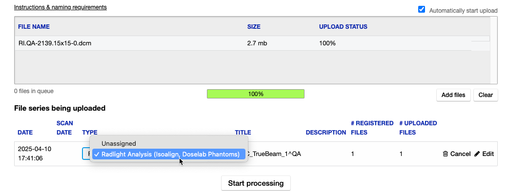 Once file series have been uploaded they will be displayed below the upload control. To remove a series from the queue click the Cancel button beside the series. To start processing click the Start Processing button. A description for the image series can be added at this point. Click the Edit button next to the series. Type a description for the series into the text box that appears below Description and either click Save or press the enter key. The description can also be edited after the images have been processed. Descriptions will appear in the report with the analysis of the series.
