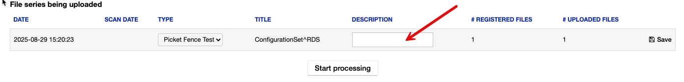 Once file series have been uploaded they will be displayed below the upload control. To remove a series from the queue click the Cancel button beside the series. To start processing click the Start Processing button. A description for the image series can be added at this point. Click the Edit button next to the series. Type a description for the series into the text box that appears below Description and either click Save or press the enter key. The description can also be edited after the images have been processed. Descriptions will appear in the report with the analysis of the series.