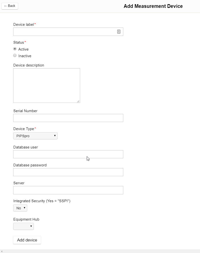 Before performing this configuration ensure that the PIPSpro database is installed and functioning correctly. The PIPSPro will need to be set up from the “Manage Measurement Devices” page.