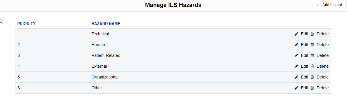 To manage ILS hazard Labels, click Manage on the main navigation pane and then click the Hazards link. Below is an example of the Manage ILS Hazards screen: