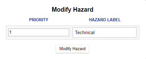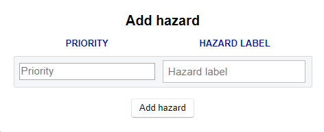 Click on the + Add hazard button to add a new hazard or click the Edit button to edit an existing hazard. Either choice will display a similar popup where a new hazard can be edited or an existing hazard modified: