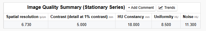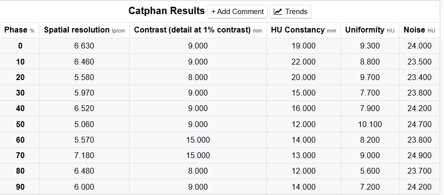 - HU Constancy: Max absolute difference from expected CT numbers for air (-1000 HU), LDPE (-100 HU), and acrylic (120 HU).