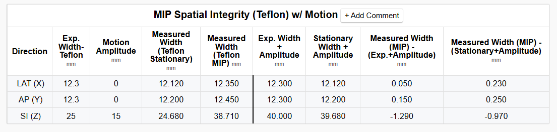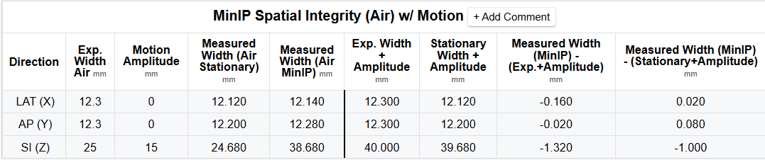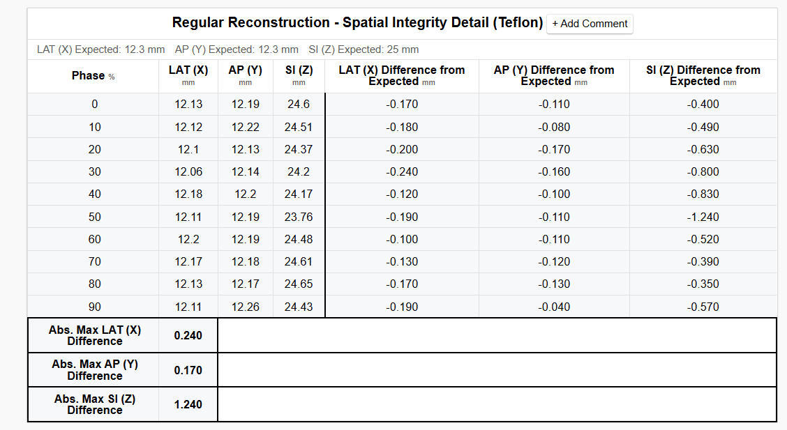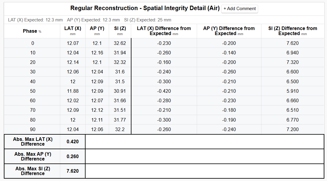 Upload of multiple phased (or binned) sets of images reconstructed at specific points in the motion cycle. The spatial integrity measurements are made for each series and compared against the expected values and the statistics for the stationary series above. The Z-position of the Teflon plug and air void are also reported for each series.