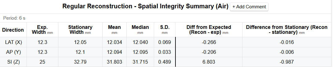 - Measured Width (Air Stationary): The measured dimensions of the Catphan air void in the stationary image set in mm.