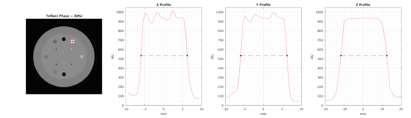 - Threshold: The mean HU of the sensitometry measurements of the Acrylic and Teflon plugs. This threshold value is where the widths of the x, y, and z profiles of the Teflon plug are determined.