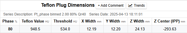 - Z Center (IPP): The interpolated center in mm of the Teflon plug’s z profile using the Image Position Patient DICOM tags of the slices.